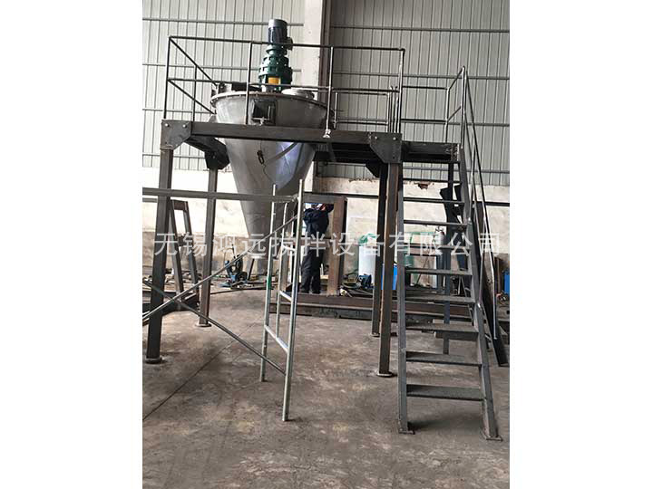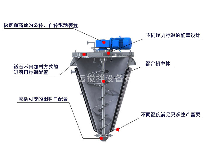 設備設有多種樣式(刮板、內螺旋、外螺帶),也可以雙錐體結構,適應不同物料,適應較高粘度的流體物料混合。螺帶式混合機,它是攪拌粘性流體或稠狀、濕狀、膏狀為主,也可以混合粉體。